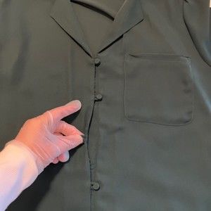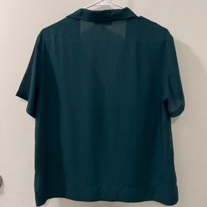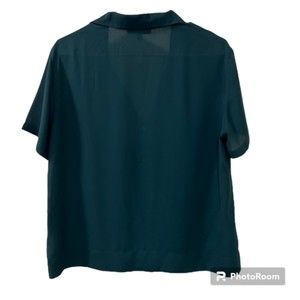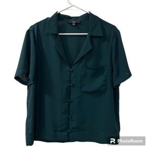 Chic dark green blouse. Button-up front. Short sleeves. Classic collar. Perfect for any occasion.