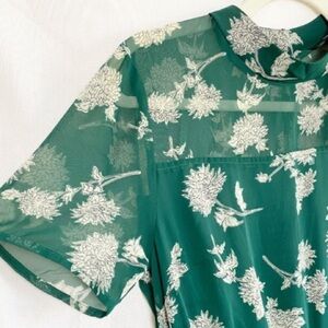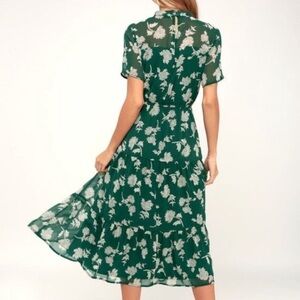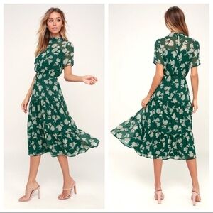 Floral Dressed Up Dark Green Floral Print Midi Dress in Excellent Condition, lovely look for an evening out with the Lulus Floral Dressed Up Dark Green Floral Print Midi Dress! Elegant cream and black floral print embellished lightweight woven fabric as it forms a mock neck (with back button closure), sheer decolletage and short sleeves, and a darted bodice. Elastic waist tops a tiered skirt that flows to a modest midi length. Pair with strappy heels and a clutch for the perfect date night 'fit!