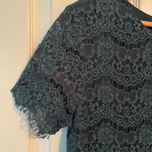 Stylish dark green dress with intricate lace overlay. Ideal for special events.