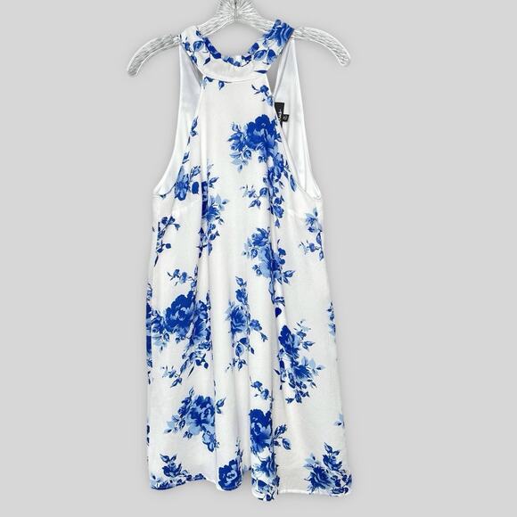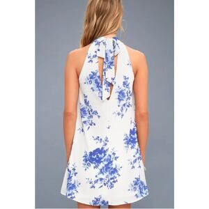 Blue and white floral halter neck dress.