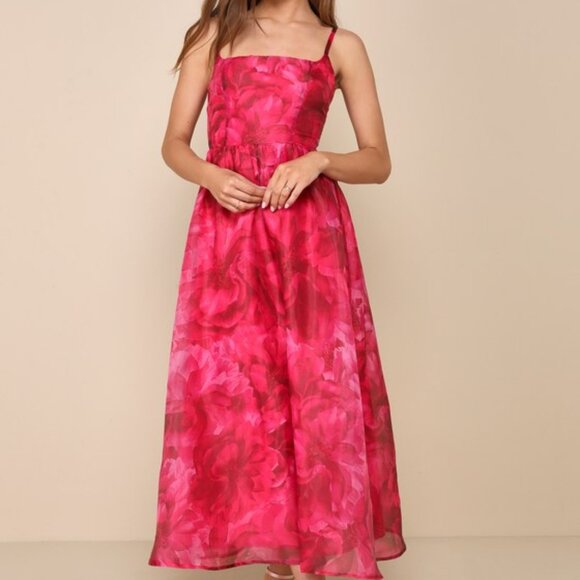 Lulus Darling Icon Dark Pink Floral Organza Lace-up Midi Dress - Size L
