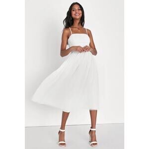 The Lulus Darling Sweetheart White Swiss Dot Ruched Midi Dress is your ticket to an endless number of admirers and compliments! Airy mesh, adorned with Swiss dots throughout, falls from adjustable spaghetti straps into a straight neckline and a princess-seamed bodice with trendy ruching on each side. High, fitted waist sits atop a cute A-line skirt that ends at a chic midi hem. Hidden back zipper/clasp.