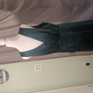 Chic satin dress with a sleeveless design. Features a deep hunter green hue. Deep V in front and back. Tacky strips at shoulders to keep it where it belongs.Holidays are coming up! Full maxi dress. Back zipper and front slit.