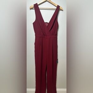 Elegant deep red jumpsuit. Sleeveless with a V-neckline. Perfect for any occasion.