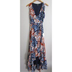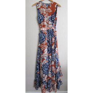 Lulus Desert Trip Orange Blue Chiffon Floral Wrap Ruffle Maxi Dress XS NWT
