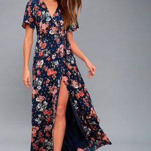 Lulu's Divine Days Navy Blue Floral Print Wrap Maxi Dress S