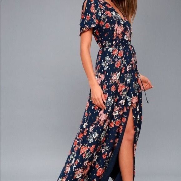 Lulus Stunning Divine Days Navy Blue Floral Print Wrap Maxi Dress Size Medium