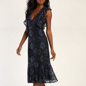 We're totally captivated by the elegant vibes of the Lulus Divinely Dramatic Black and Navy Blue Lace Midi Dress! Moody floral lace overlay shapes wide tank straps with ruffled trim. Trim continues down the seamed bodice, echoing the plunging V-neckline. Fitted waist tops a slightly flared skirt that falls to a midi hem with a band of flirty flounce trim. Hidden zipper/clasp at back.