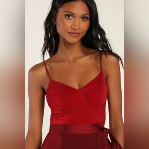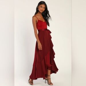 Lulus Double Darling Burgundy Color Block Satin Ruffled Maxi Dress S Wedding. New without tags. See all pictures for details. Currently SOLD OUT online.