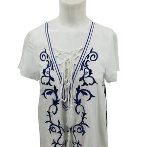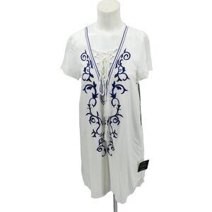 Lulus Down in Kokomo Lace Up Embroidered Shift Dress Size S White Blue New Boho