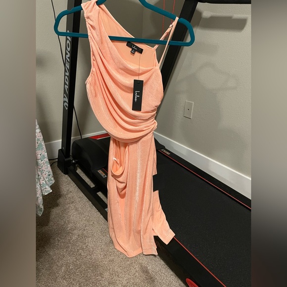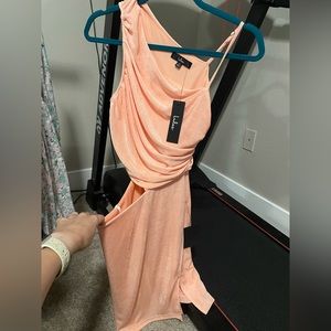 Lulus cut and run peach dress Ruched cutout asymmetrical bodycon mini dress Fully lined New with tags Size small