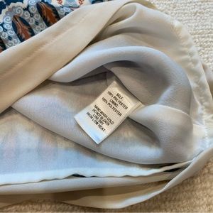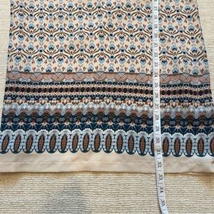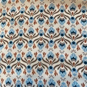 -Cream base w/olive green,orange,blue,teal w/tile print