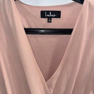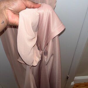 Pale pink (almost mauve) long dress. Short sheer flowy sleeves. Waist detail, fully lines.