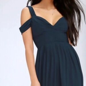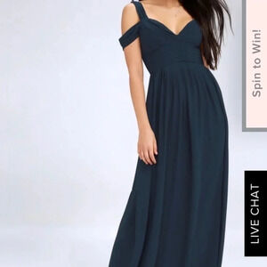 Stunning formal dress in navy blue. Zip closure at back. 17” bust and 60” length. Poly.