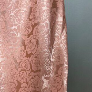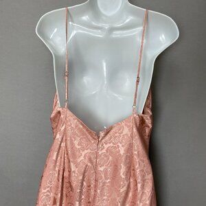 Lulus women's slinky midi slip dress in a pink iridescent rose pattern. Side slit, cowl neck, bare back, spaghetti straps. Zipper in back. Shell is 97% Polyester and 3% Spandex. Lining is 100% Polyester.