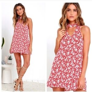 Lulu's Dress Small Red Floral Print High Neck Swing 26-249LD Back Keyhole