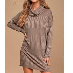 Lulu's Tan Ribbed Cowl Neck Sweater Dress Mini Long Sleeve Size Small Neutral
