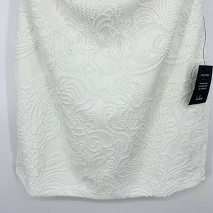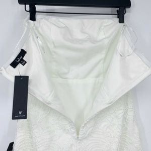 Lulus Dress Womens Size Small White Got Your Attention Embroidered Strapless Bodycon. New with tags. Inside lining. This knockout of a cocktail dress begins with a sheer overlay that is embroidered with a dotted abstract design that forms a strapless neckline (with hidden no-slip strips and side boning), a seamed bodice, and a fitted waist. Figure-skimming bodycon fit continues to the mini hem. Hidden back zipper/clasp. Perfect for a bride/wedding, bridal shower, bachelorette party!