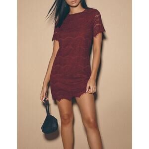 Perfect for many occasions, the Lulus Take Me to Brunch Burgundy Lace Shift Dress is sure to become a staple in your wardrobe! Lively eyelash lace creates an eye-catching overlay across knit fabric through a rounded neckline, and into sheer short sleeves. Shift silhouette and scalloped hem. Hidden back zipper with clasp.