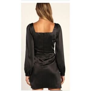This is a black satin mini dress from the brand Lulu's, featuring a square neck, long sleeves, and a fit & flare style. It has a zip closure and is made of polyester and spandex fabric. The dress is size Medium and suitable for occasions like weddings and parties. It has a collarless design and is perfect for winter, summer, fall, and spring seasons.