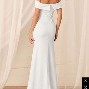 New without Tags Lulus Song of Love White Off-the-Shoulder Maxi Dress! An overlapping, off-the-shoulder neckline creates a romantic look atop this stunning maxi dress, composed of medium-weight stretch knit. Princess-seamed bodice carries into a fitted waist and figure-flaunting mermaid skirt with a sultry side slit. Hidden back zipper/clasp.