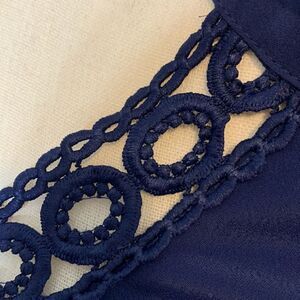 No matter where you wear it, the Lulus Any Sway, Shape, or Form Navy Blue Lace Halter Dress will turn heads! Breezy woven poly ties at a halter neckline atop a sleeveless bodice with crocheted lace trim. Open back and trapeze silhouette offer the perfect flirty finish. Hidden back zipper.