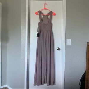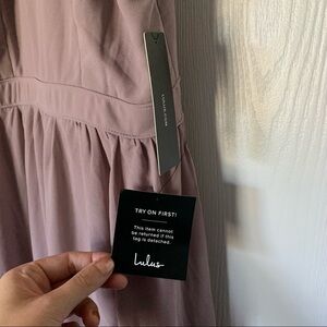 NWT beautiful formal gown from Lulus in a size Small. This dress features a high neck, halter style in a beautiful dusty purple color. Cinched waist and a straight skirt. Perfect for a bridesmaid or prom dress! No stains or flaws!m