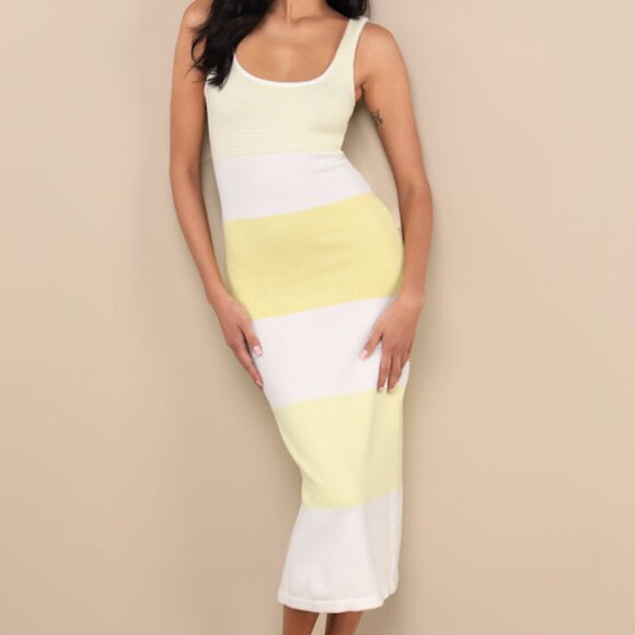 The Lulus Easily Gorgeous Ivory and Yellow Striped Midi Sweater Dress was made for a laidback babe like you! Soft and stretchy sweater knit, with an ivory and yellow striped pattern throughout, shapes this casually cute dress with a square neckline, a fit