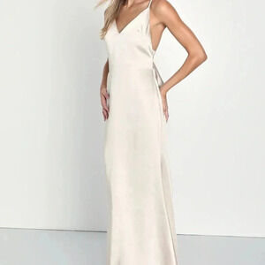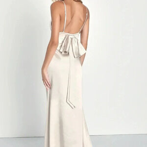 Luxe woven satin shapes this lovely dress that starts with adjustable spaghetti straps, a flirty V-neckline, and a darted bodice with a sexy backless design. The flattering slip-style silhouette will flaunt your figure perfectly as it falls to a sweeping maxi hem. An oversized, bow-inspired detail lends an ultra-chic finish! Hidden back zipper/clasp. The product tag has been removed but this dress has never been worn. The Lulus size tag and hanger ties may be cut in half or removed to prevent returns to Lulu's. If the size tag was removed, these dresses were thoroughly measured and compared to Lulu's size chart.