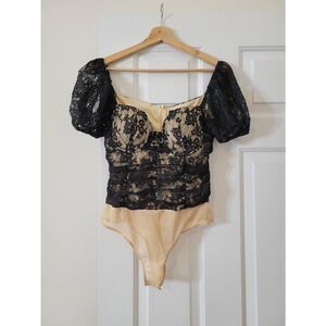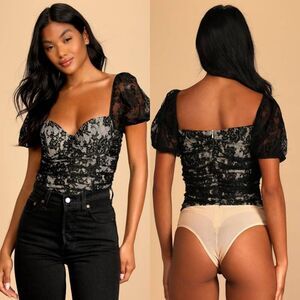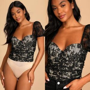 Lulus Elegant Demeanor Black Lace Puff Sleeve Bustier Bodysuit L NWT