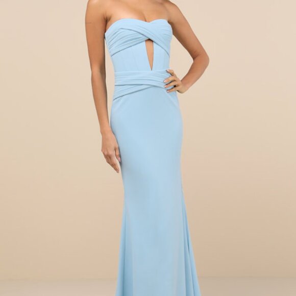 Stunning Lulus Light Blue Strapless Maxi Dress - A must-have for your special occasion wardrobe! This elegant gown features a chic cutout design and flattering silhouette that accentuates your curves. Soft light blue fabric, floor-length style, and stretchy fit make it comfortable and eye-catching. Worn once, in perfect condition. Originally $88, now a steal for the fashion-forward woman looking to make a statement at any event.