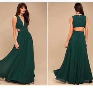 Stunning green maxi dress. Features a deep V-neck and cutout sides. Flowy skirt with pleated back detail.