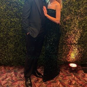 Stunning strapless gown with shimmering green sequins. Perfect for formal events.