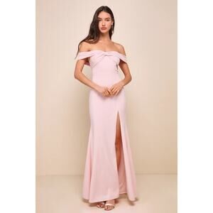 Lulus “Elegant Perception” Light Pink Off-the-Shoulder Bow Maxi Dress – Large