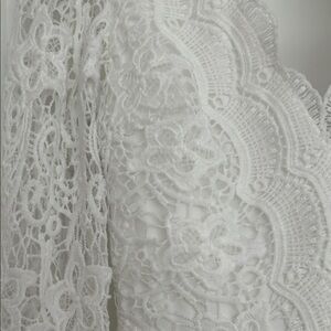 Stunning white lace wedding dress. Features long sleeves and a flowing skirt. Perfect for a classic bridal look.