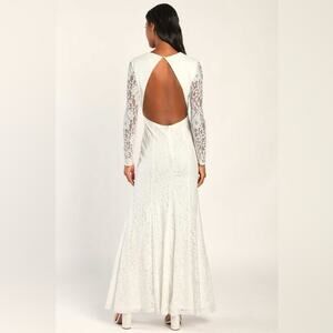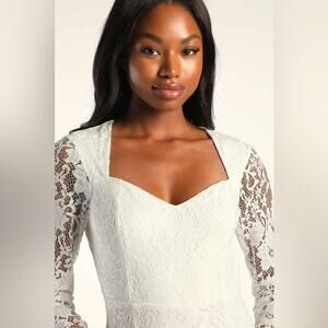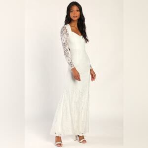 Stunning white lace dress. Long sleeves with intricate lace detail. Perfect for weddings.