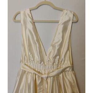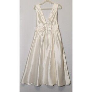 Make a statement in this off-white midi gown, perfect for weddings, proms, and rehearsal dinners. Designed with a deep V-neck and back, this dress exudes elegance. The polyester fabric mimics raw silk, offering a luxurious look. Fully lined for comfort, it features a bow front and tie-back detail. The open sides from shoulder to waist add a modern touch, while the zipper closure ensures a secure fit.