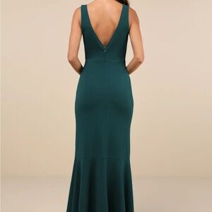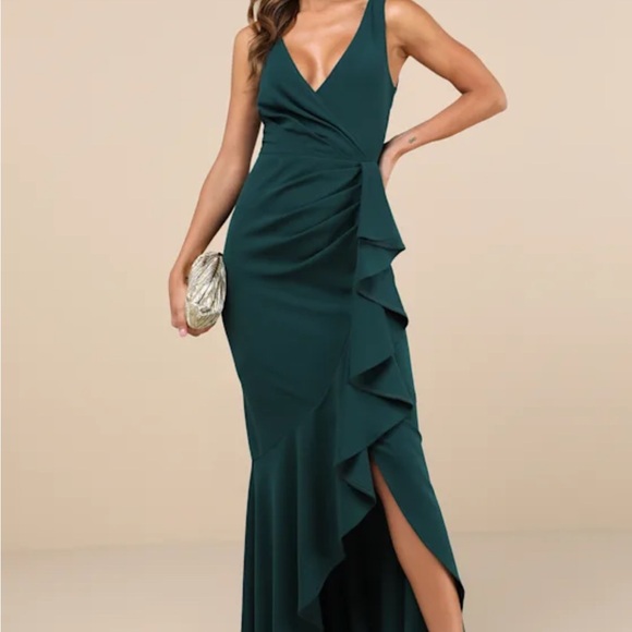 Elegant emerald dress with cascading ruffles. Ideal for weddings.