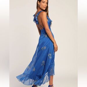 Lulu’s Enchanting Elegance Blue Floral Ruffle neck High Low Chiffon Dress | Size XL