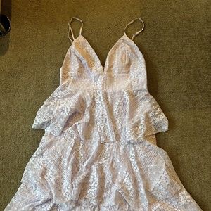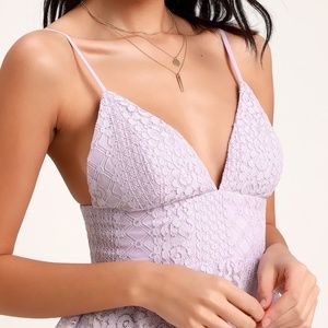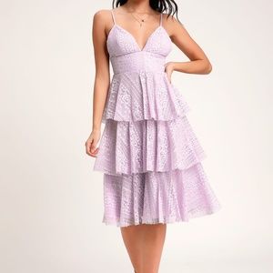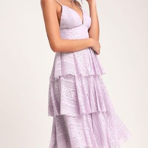 Lulus Exclusive! Keep the spark alive with the Lulus Endless Romance Lavender Lace Ruffled Midi Dress! Three tiers of flouncy ruffles (made from lightweight elegant lace) shape a midi skirt that tumbles below a high, fitted waist and a plunging triangle bodice. Adjustable spaghetti straps. Hidden back zipper/clasp.