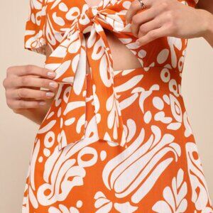 Lulus Energetic Charm Rust Orange Abstract Tie-Front Midi Dress, NWT, Size Small
