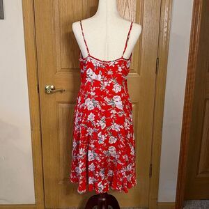 This dress is made by Lulus. It’s a red floral midi dress with a flattering and feminine design. It features a v-neckline with thin spaghetti straps, creating a delicate and summery look. The dress has a fitted bodice that accentuates the waist and flows into a flared, A-line skirt that falls to mid-calf length. A subtle front slit adds a touch of allure and ease of movement. The floral print consists of white and light pink flowers with green leaves, beautifully contrasting the vibrant red background. The back of the dress has a simple, smooth finish with a zipper and hook and eye closure for a secure fit. Size large and in wonderful pre owned condition. Smoke and pet free home.