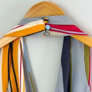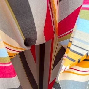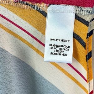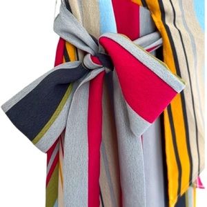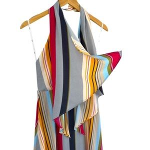 • Buttoning halter neckline and chic, draping bodice, with modesty clasps, are made from lightweight woven fabric in a sunny light blue, yellow, magenta, white, and denim blue striped pattern. Fitted waist with tying sash and a cascading full maxi skirt. Open back and hidden zipper/clasp.