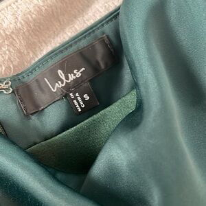 Keywords: Lulus dress, emerald green gown, satin maxi dress, formal evening wear, square neckline dress, long sleeve dress, wedding guest outfit, elegant slit dress, special occasion dress, timeless glamour, romantic style