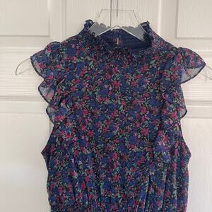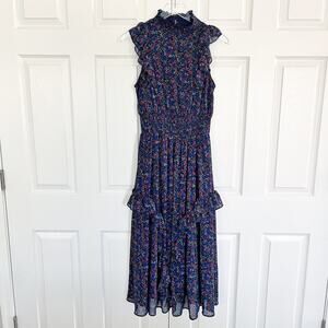 A smocked, mock neckline starts off this frilly frock with ruffled shoulders, a sleeveless bodice, and a pretty navy blue, magenta, and green floral print. Flowy woven chiffon shapes a smocked waist and midi skirt, punctuated with ruffled tiers. Back keyhole with two top buttons.