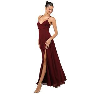 You're certain to stun when you arrive at the party wearing the Lulus Event Ready Burgundy Backless Lace-Up Maxi Dress! Airy woven chiffon shapes this chic and elegant dress. Slender spaghetti straps lace up the open back, supporting a bodice with a V-neckline and a lightly pleated, cross-front design. Skirt falls from an empire waist, finishing at a sweeping maxi hem with a sultry, thigh-high side slit. Hidden zipper/clasp at back.