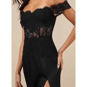 Lulus Exceptionally Exquisite Black Lace Off-the-Shoulder Maxi Dress! Dramatic floral eyelash lace shapes a sweetheart neckline (with hidden no-slip strips) framed by elegant off-the-shoulder short sleeves. The bustier-style bodice features supportive side boning and an alluring sheer panel at the front and back. Sleek woven satin meets the bodice as it forms a mermaid maxi skirt with a sultry, thigh-high side slit. Hidden back zipper/clasp.