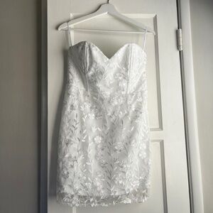 Chic strapless dress with floral lace. Perfect for bridal events and special occasions.