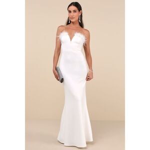 Lulus Extraordinary Glam White Feather Strapless Mermaid Maxi Dress Size Large