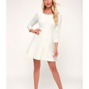 Lulus Exclusive! Sing, dance, and smile the night away in the Lulus Felicity White Backless Lace Skater Dress! Medium-weight, stretch woven fabric dances from a rounded neckline into a fitted darted bodice framed by fitted three-quarter length sleeves. A fitted waist tops a classic skater skirt. The details don't stop there! Lovely eyelash lace frames a backless design with a top button closure and a hidden zipper/clasp.